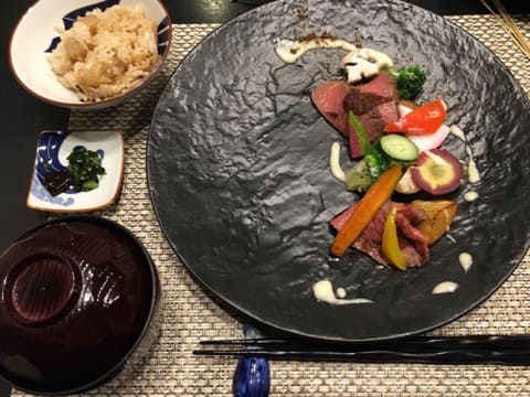 メインの佐賀牛ローストビーフとご飯と味噌汁